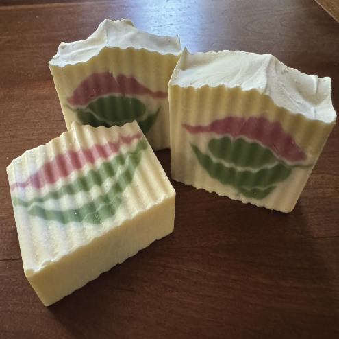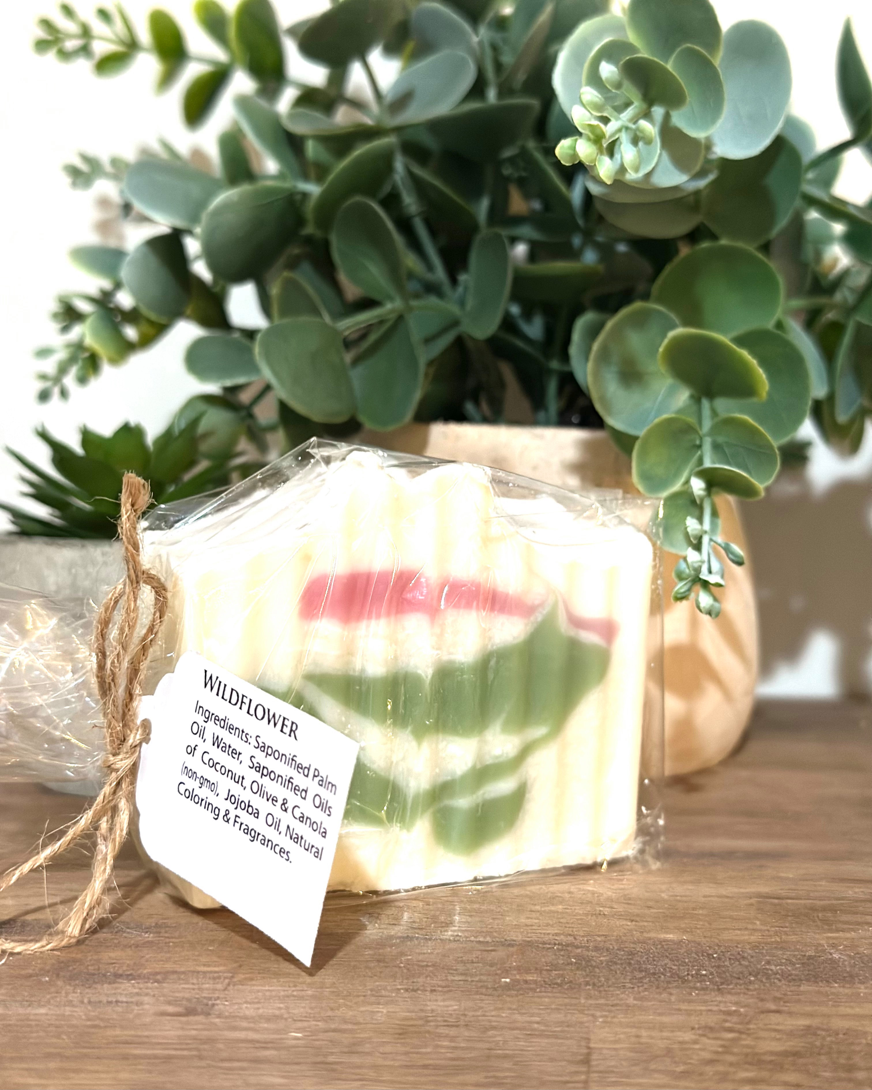 Ingredients: Saponified Palm Oil, Water, Saponified Oils of Coconut, Olive & Canola (non-GMO), Jojoba Oil, Natural Coloring & Fragrances.
