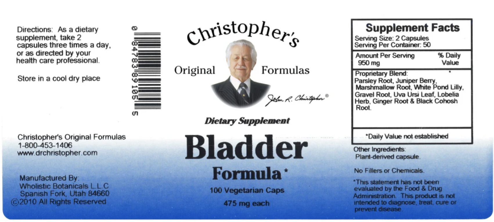Servings per container: 50Amount per Serving: 900 mg% Daily ValueProprietary Blend:*Parsley Root, Wildcrafted Juniper Berry, Wildcrafted Marshmallow Root, Wildcrafted White Pond Lily, Organic Gravel Root, Wildcrafted Uva Ursi Leaf, Organic Ginger Root & Wildcrafted Black Cohosh Root.* Daily Value not established.